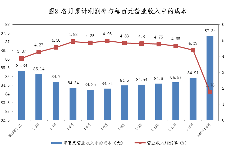 1-2月份,规模以上工业企业每百元营业收入中的成本为87.34元,同比增加1.87元;每百元营业收入中的费用为8.44元,同比减少0.48元。